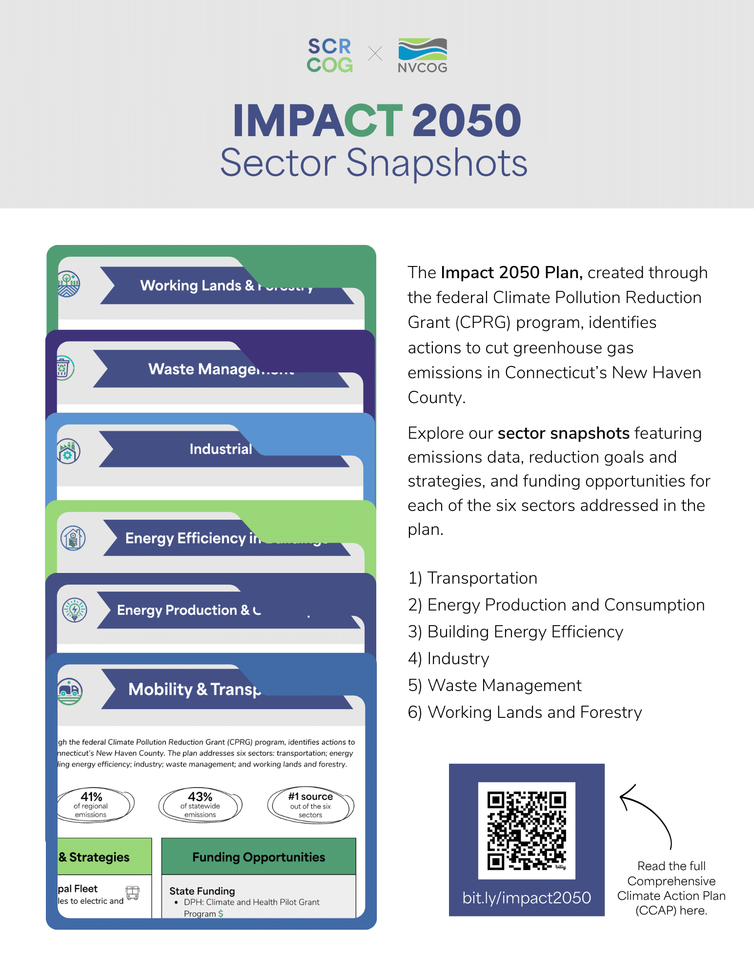 In July 2023, SCRCOG was awarded a Climate Pollution Reduction Grant (CPRG) of $1 million through the Environmental Protection Agency (EPA). Established through the Inflation Reduction Act, the CPRG program supports state and metropolitan areas to make and implement plans to reduce greenhouse gas emissions (GHGs), with 40% of the benefits flowing to low-income and disadvantaged communities. This four-year grant funds two stages of climate action planning for the New Haven-Milford region: (1) a Priority Climate Action Plan (PCAP) that addresses short term solutions for GHG reduction efforts, and (2) a Comprehensive Climate Action Plan (CCAP) that addresses long term goals. SCRCOG, in collaboration with the Naugatuck Valley Council of Governments (NVCOG), the University of Massachusetts Amherst, and SLR consultants have completed both plans outlining a regional greenhouse gas inventory and offering direct solutions for municipalities to improve air quality, create jobs, and ensure the region’s low-income and disadvantaged communities are prioritized.